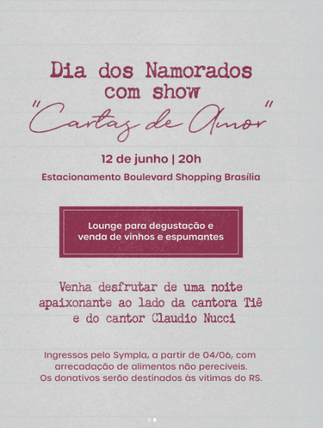 Para deixar a data mais romântica do calendário ainda mais apaixonante, o Boulevard Shopping Brasília, administrado pela NIAD, recebe a cantora Tiê e seu convidado Claudio Nucci, que apresentam o show “Cartas de Amor”, em celebração ao Dia dos Namorados, no próprio dia 12 de junho, com abertura dos portões às 19h e início do show às 20h, na área externa do shopping, com ingressos gratuitos e retirada pelo Sympla, a partir de 04 de junho.