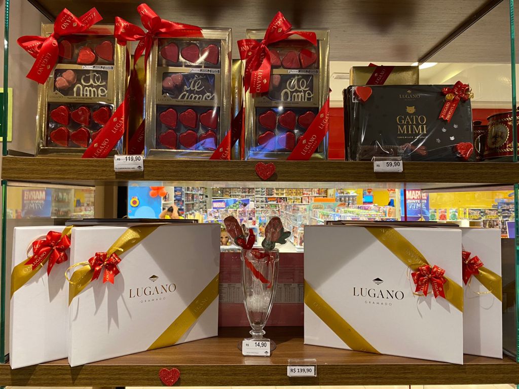 Um dos presentes mais clássicos da data é o bom e irresistível chocolate. Na Lindt, recém-inaugurada no shopping, além de cestas customizadas pelo consumidor, a operação preparou uma oferta especial para a Pralina Creation Dessert, uma coleção de bombons finos inspirados nas clássicas sobremesas: pudim, éclair, tiramissu, crème brulée e fondue. A caixa sai de R$ 109,90, para R$ 89,90. A marca ainda oferece descontos progressivos nas barras, em qualquer linha ou sabor. Na compra de duas unidades, 10%; com três unidades, o desconto é de 15%, e, ao levar quatro ou mais barras, 20%. Já na Lugano é possível montar cestas, caixas ou pacotes de com itens à escolha do cliente, a partir de R$ 59,99. Em conjunto mais completos, é possível incluir, além dos bombons e barras de chocolate com toda a variedade oferecida pela marca, bebidas, como vinho, espumante e licor.