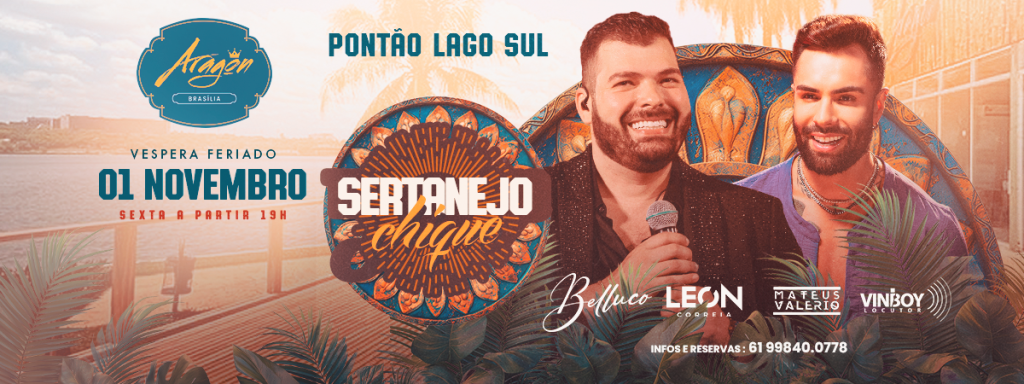 Nesta sexta-feira, 01 de novembro, o Restaurante Aragon, localizado à beira do lago no Pontão do Lago Sul, será o destino ideal para quem quer aproveitar a véspera de feriado com muito estilo. A partir das 19h, o público poderá curtir uma noite com o novo projeto da casa “Sertanejo Chic”. E para dar start, show imperdível com os cantores Belluco e Leon Correia, além dos DJs Matheus Valério e Viniboy.