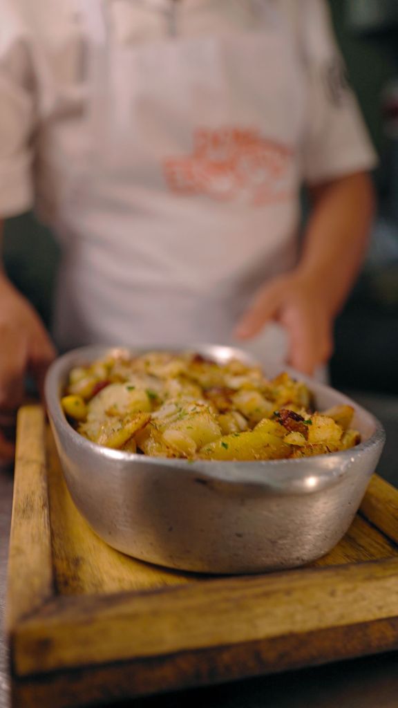 Bacalhau aromático – Criação da casa, bacalhau em lascas refogado com alho poró, talos de erva doce e cebola pérola. Finalizado ao forno, sobre cama de batatas. Prato leve e perfumado.
