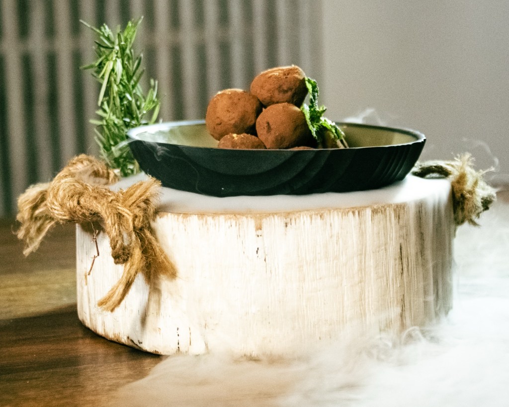 As sobremesas completam a experiência mágica. O Bosque das Trufas combina trufas de chocolate artesanal com creme de aveia ou brigadeiro e um toque de canela, criando uma sobremesa reconfortante. Uma seleção mágica de macarons encantados, pousados delicadamente sobre uma base de chocolate rosa nos sabores: chocolate, pistache, framboesa, doce de leite e limão, compõem as Joias do Reino. Já a Floresta Encantada surpreende com profiteroles recheados, uma árvore de algodão doce e calda quente de chocolate derramada à mesa, encantando os olhos e o paladar.