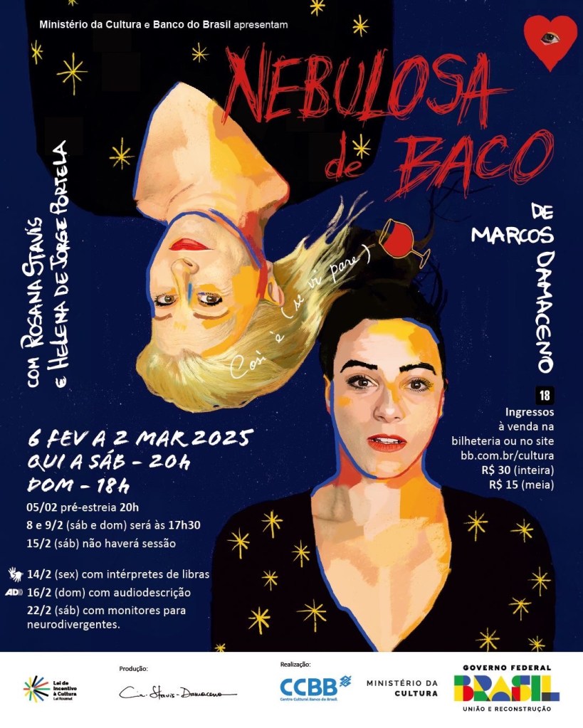 Novo espetáculo da premiada Cia. Stavis-Damaceno, “Nebulosa de Baco”, com dramaturgia e direção de Marcos Damaceno, e atuação de Rosana Stavis e Helena de Jorge Portela, faz temporada de 5 de fevereiro a 2 de março de 2025, no Centro Cultural Banco do Brasil Brasília. O espetáculo, que se alterna entre o drama e a comédia, apresenta o difícil processo de duas atrizes ao interpretarem os papéis conturbados de uma filha e o seu pai; e navega sobre o conceito do que é verdade e o que é inventado, ou até onde conseguimos chegar à verdade.  A peça tempatrocínio do Banco do Brasil, por meio da Lei Federal de Incentivo à Cultura (Lei Rouanet) e as sessões acontecem de quinta a sábado, às 20h, e domingo, às 18h. Exceção para os dias 8 e 9 de fevereiro, quando as sessões são às 17h30, e no dia 15, quando não haverá sessão.