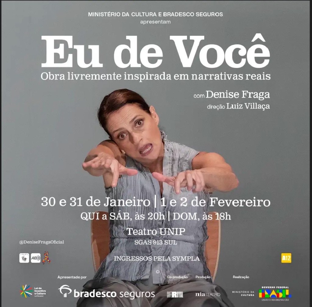EU DE VOCÊ , idealizado e criado pela atriz Denise Fraga, o produtor José Maria e o diretor Luiz Villaça, está de volta à Brasília depois de uma temporada de sucesso em 2024. A peça, que mostra histórias reais, costuradas com pérolas da literatura, música, imagens e poesia, estará em cartaz na capital federal de 30 de janeiro a 2 de fevereiro, quinta a sábado, às 20h, e domingo, às 18h, no Teatro Unip.