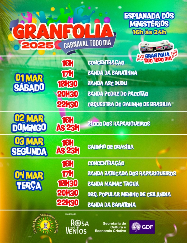 “O Gran Folia é um patrimônio do Carnaval de Brasília. Estamos preparando uma festa segura, inclusiva e cheia de energia para receber milhares de foliões ao longo da programação. A Esplanada será palco de uma celebração única, que exalta nossa cultura e valoriza os blocos tradicionais da cidade”, destaca Paulo Henrique Nadiceo, presidente da Liga Carnavalesca dos Trios, Bandas e Blocos Tradicionais.