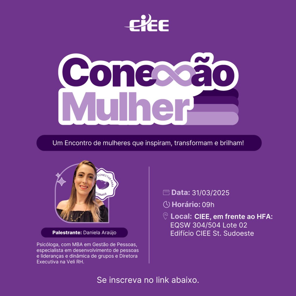 Com foco no fortalecimento de vínculos, trocas de experiências e inspiração entre mulheres, o Centro de Integração Empresa-Escola – CIEE promove o evento “Conexão Mulher”, um encontro presencial e gratuito voltado exclusivamente ao público feminino. A programação inclui a palestra “A Carreira como Jornada – Construindo um Futuro com Propósito”, ministrada por Daniela Araújo Lustosa, psicóloga com MBA em Gestão de Pessoas, especialista em desenvolvimento de lideranças, dinâmica de grupos e Diretora Executiva da Véli RH Brasil, que compartilhará sua trajetória e reflexões sobre propósito e carreira. A atividade será realizada no Edifício CIEE, no Setor Sudoeste de Brasília, no dia 31 de março de 2025, às 9h.