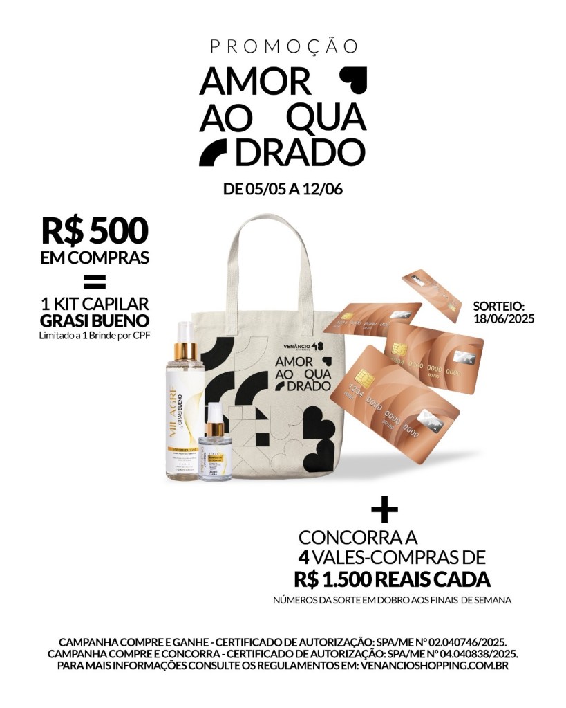 De 5 de maio a 12 de junho, o Venâncio Shopping realiza a campanha especial de Dia das Mães e Namorados “Amor ao Quadrado”, com ações promocionais que combinam carinho, cuidado e boas oportunidades de compras. Juntando R$ 500 em compras, os clientes ganham um Kit de Cabelo Grasi Bueno — contendo um sérum reparador de pontas e um spray protetor térmico — e ainda passam a concorrer a vale-compras de R$ 1.500 cada, válidos para uso nas lojas participantes da promoção. Ao todo serão sorteados 4 vales – compra, no dia 18/06/25. O brinde é limitado a um por CPF e pode ser retirado no balcão de informações, no térreo, enquanto durarem os estoques.