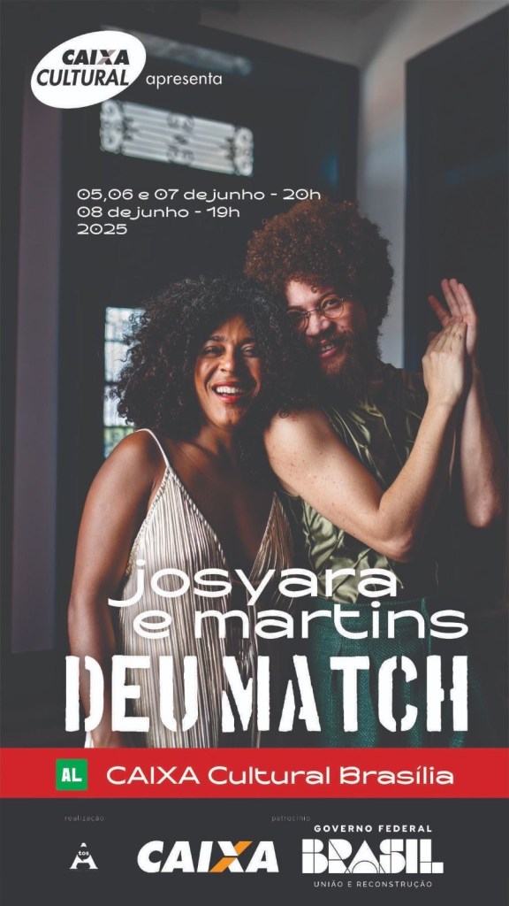 A CAIXA Cultural Brasília recebe, de 5 a 8 de junho(quinta-feira a domingo), o espetáculo Deu match, que reúne no palco Josyara e Martins, dois expoentes da nova música brasileira. O setlist mescla canções do repertório dos artistas, além de trazer também músicas inéditas e algumas versões do cancioneiro brasileiro. Os ingressos custam R$ 30 (inteira) e R$ 15 (meia-entrada) e podem ser adquiridos a partir de 31 de maio, às 9h, na bilheteria do teatro, e às 13h, no site bilheteria Cultural: https://bilheteriacultural.com.br