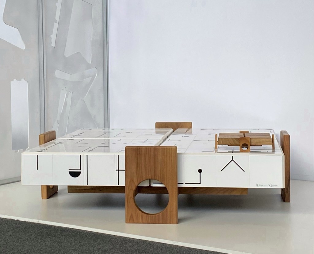 O resgate também é feito por meio dos traços marcantes no design de mobílias e objetos de Janete Costa, com a exposição de peças autorais, como Banco Rio, Chaise Lucia e Poltrona Cláudia.