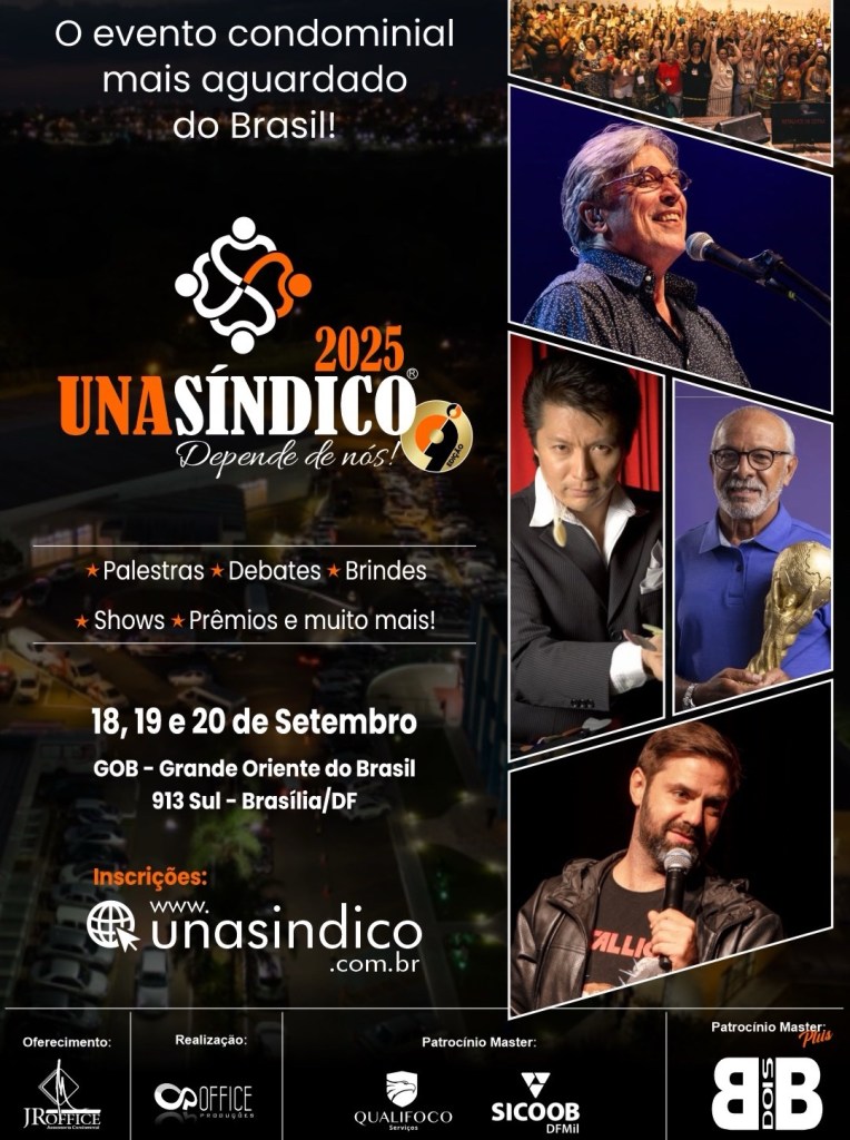 O evento mais tradicional e já inserido no calendário de eventos do DF, a UNASINDICO 2025, vem com sua 9ª Edição cada vez maior e mais completa. Nesta edição sobre vai se emocionar, vai sorrir e vai aprender muito sobre gestão condominial. Mais de 5.000 síndicos de Brasília de todo Brasil estarão presentes para contemplar este mega evento.