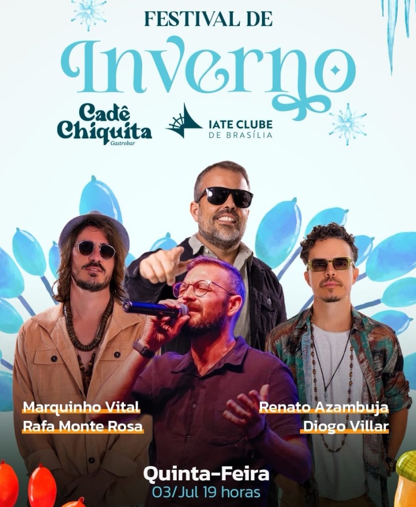 O inverno segue em clima de celebração no Iate Clube de Brasília com mais uma edição do Festival de Inverno do Cadê Chiquita. Nesta quinta-feira, 3 de julho, a partir das 19h, o público poderá curtir uma noite intimista, à beira do lago, com música ao vivo. Quem comanda o palco desta vez é Marquinho Vital, músico e compositor reconhecido por sua performance vibrante e repertório cheio de brasilidade. Nesta edição, ele recebe como convidado, Diogo Villar, integrante de projetos como O Bando e o Bloco E&M, que traz ao palco sua musicalidade marcada pela mistura de ritmos, presença de palco e identidade sonora forte.