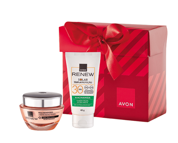 O presente com a linha Renew vem com duas opções de cuidados coma pele: o Renew Power Creme Facial vem no formato mais queridinho das brasileiras/brasileiros: o creme. Ele deixa a pele hidratada instantaneamente, além de reverter anos de perda de colágeno e deixar a pele mais firme e preenchida e o Renew Solar Facial FPS30, formulado com Niacinamida e partículas matificantes que reduzem o excesso de oleosidade da pele. Oferece alta proteção dos raios UVA/UVB. Minimiza os efeitos causados pela luz visível e pelos raios infravermelhos. Indicado para pele muito sensível a queimadura solar. Não deixa a pele esbranquiçada.