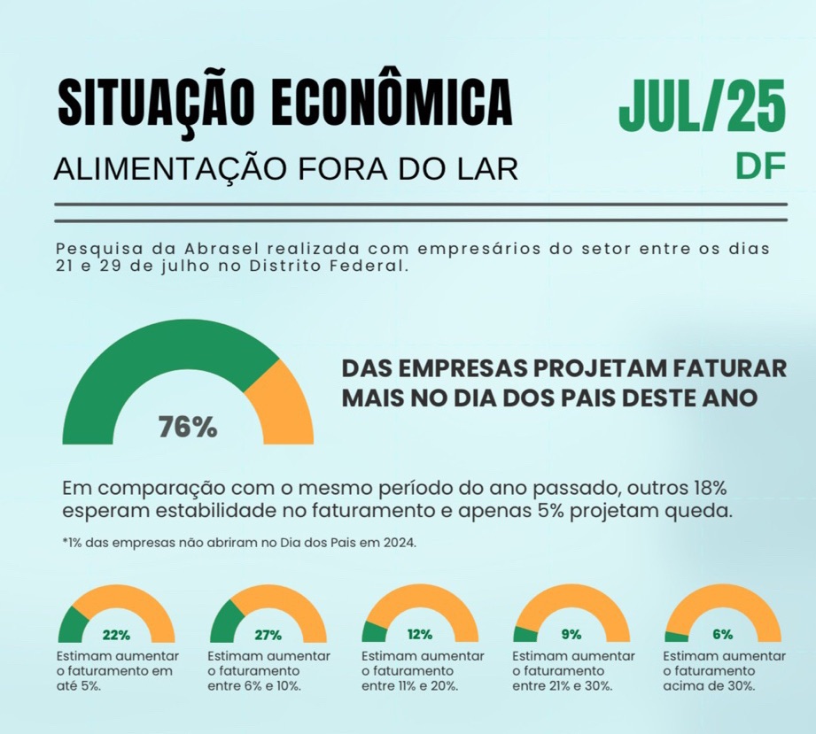 A proximidade do Dia dos Pais tem trazido otimismo ao setor de alimentação fora do lar. De acordo com pesquisa realizada pela Abrasel entre os estabelecimentos do DF que planejam abrir na data, 76% esperam um crescimento no faturamento em relação ao mesmo período do ano passado.