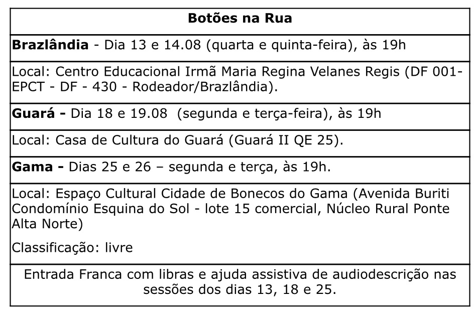 A peça abre a temporada em Brazlândia, nos dias 13 e 14/08, no Centro Educacional Irmã Maria Regina Velanes Regis, segue (18 e 19/08) para a Casa de Cultura do Guará e finaliza as sessões (25 e 26/08) no Espaço Cultural Cidade de Bonecos do Gama. Em cada cidade, a primeira sessão terá acessibilidade com libras e audiodescrição. “Escolhemos a peça Botões na Rua pela forçapoética que dialoga com a natureza feminina do projeto Linhas e Linhos – O Tecer Feminino”, adianta Jones Schneider, diretor-presidente do Instituto Cidade Céu de Arte, Educação e Cultura.