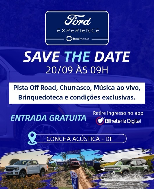 Realizado em diversas cidades pelo país, o Ford Experience vai acontecer em Brasília no dia 20 de setembro, sábado, a partir das 9h. Os ingressos gratuitos devem ser retirados pelo site da Bilheteria Digital e no dia do evento o público deve apresentar ele junto com 1kg de alimento não perecível