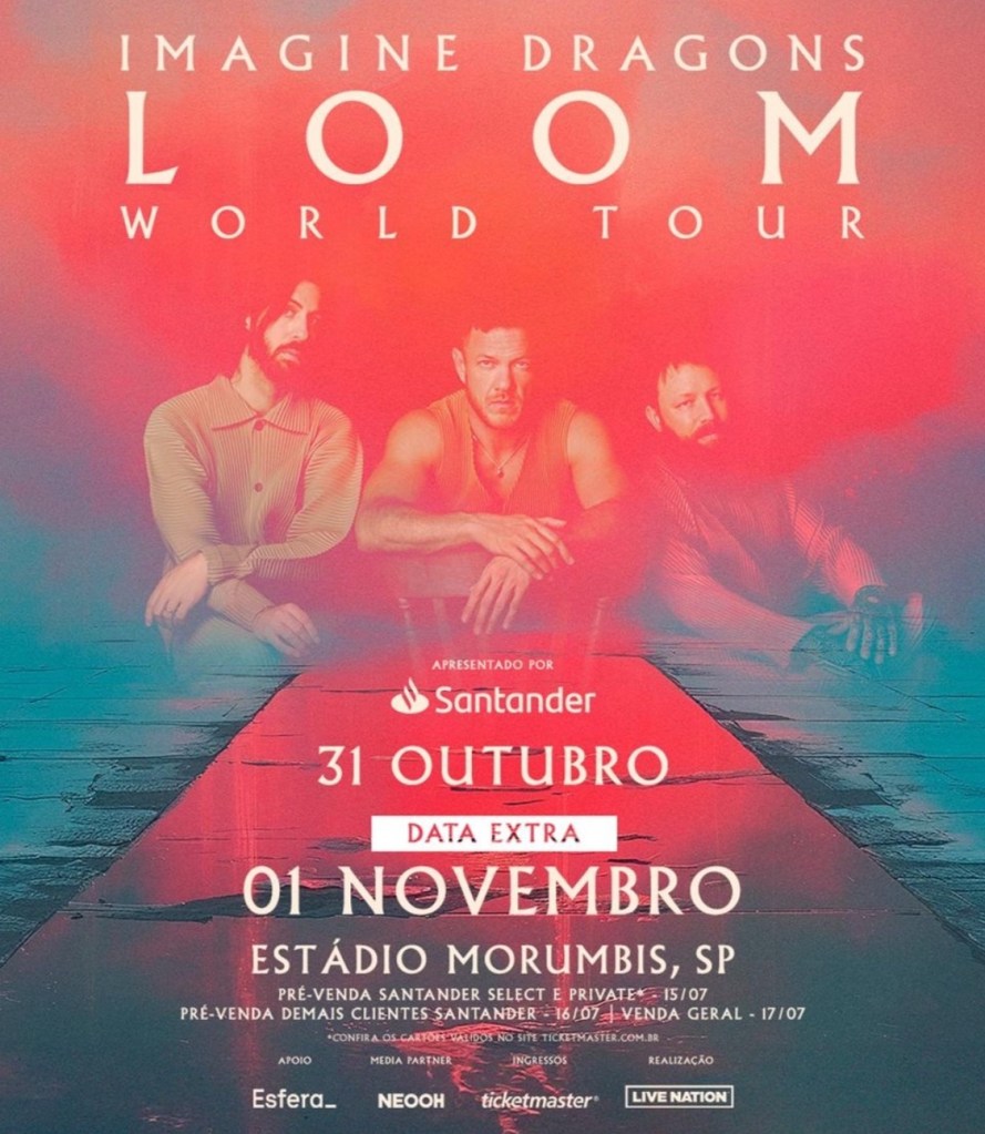 Devido a alta demanda, a banda multiplatina e vencedora do Grammy, Imagine Dragons, anuncia data extra no Brasil no dia 01 de novembro, no Estádio MorumBIS, em São Paulo