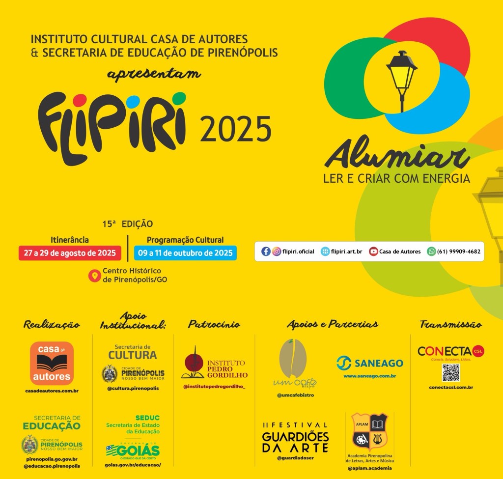 De 9 a 11 de outubro, Pirenópolis, a charmosa cidade histórica localizada entre Brasília e Goiânia, será palco de uma grande celebração da literatura, da música e das artes. Em sua 15ª edição, a FLIPIRI – Festa Literária de Pirenópolis, relevante evento da cena literária brasileira, apresenta uma programação diversa e gratuita, pensada para dialogar com a cidade, seus moradores e visitantes. “Este ano, escolhemos o tema ‘ALUMIAR – Ler e Criar com Energia’ porque acreditamos que a energia nasce das ações positivas, que impulsionam mudanças significativas. Nosso convite é para que cada participante desperte e potencialize sua força criativa, contribuindo para a construção de um mundo mais justo, humano e transformador”, destaca Iris Borges, idealizadora da Flipiri.