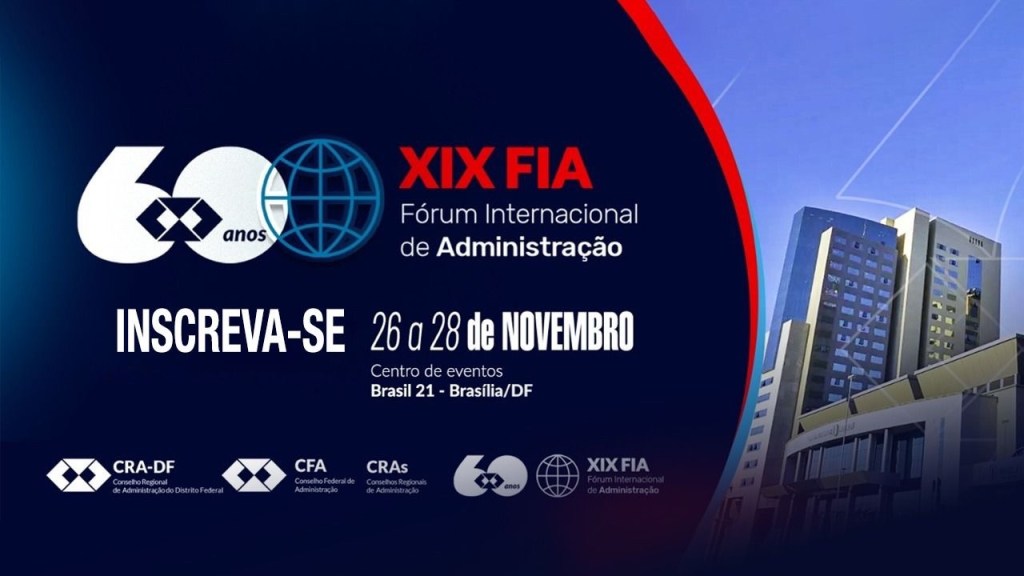 O Conselho Regional de Administração do Distrito Federal (CRA-DF), em parceria com o Conselho Federal de Administração (CFA), tem a honra de anunciar a realização do XIX Fórum Internacional de Administração (FIA 2025), que ocorrerá de 26 a 28 de novembro, no Centro de Convenções Brasil 21, em Brasília.