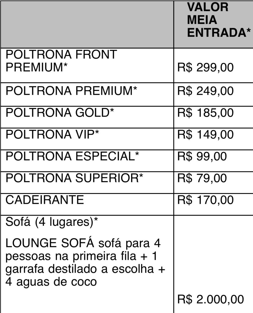 *Meia-entrada: estudantes, idosos acima de 60 anos, Pcd, professores da rede pública e funcionários públicos