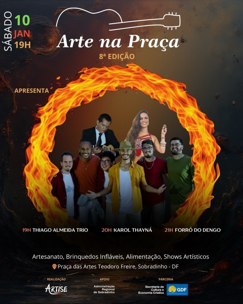 Neste sábado, 10 de janeiro, a Praça das Artes de Sobradinho (Quadra 8) será palco de uma grande despedida. A 8ª edição do projeto Arte na Praça encerra sua temporada com uma noite dedicada aos ritmos mais brasileiros: o samba e o forró. A programação é gratuita e começa a partir das 17h, com feira de artesanato e gastronomia, seguida pelos shows musicais às 19h.