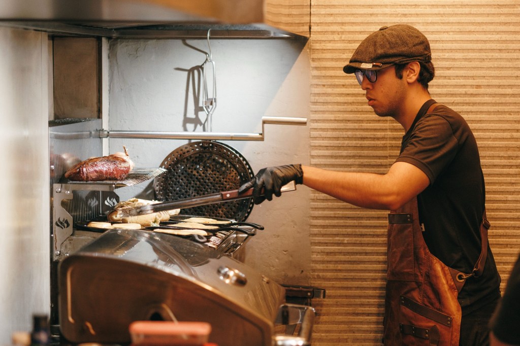 O cardápio inclui entradas como pão de alho com queijo maçaricado e provoleta com chimichurri e tomate confit. Entre os principais, estão cortes como entraña, picanha steak, ancho maturado, ancho suíno Duroc e filé de sobrecoxa com legumes, além de opção vegana com mix de legumes orgânicos.