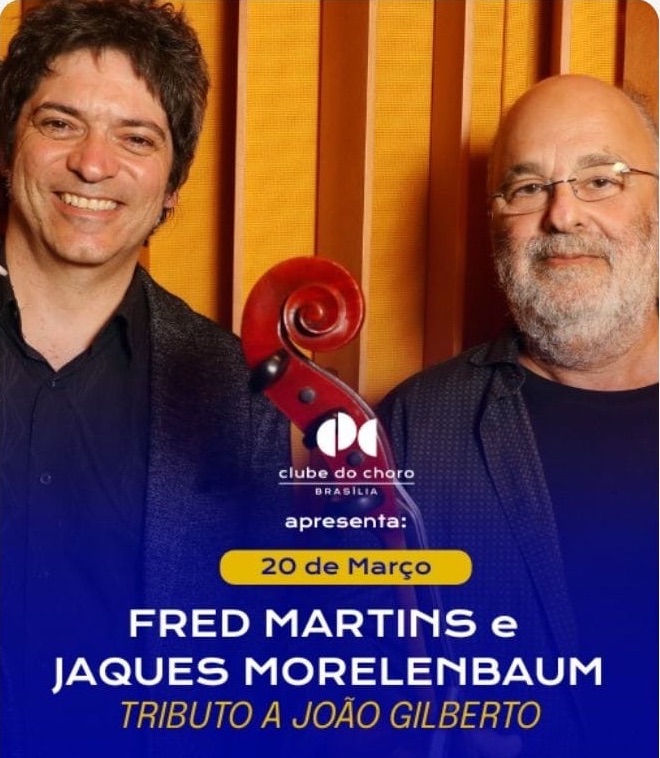 Dois grandes nomes da música brasileira, Fred Martins e Jaques Morelenbaum sobem ao palco do Clube do Choro de Brasília para uma linda homenagem ao mestre João Gilberto, celebrando a sofisticação e a delicadeza da MPB. O concerto acontece no dia 20 de março, sexta-feira, às 20h30.