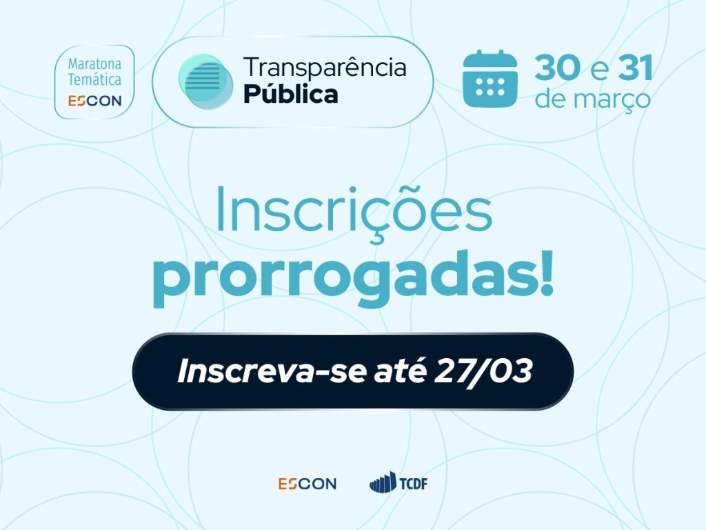 A Escola de Contas prorrogou, até sexta-feira, dia 27 de março, o prazo para inscrições na Maratona Temática “De Fiscais a Guardiões: o papel ampliado dos Tribunais de Contas na Transparência Pública”.