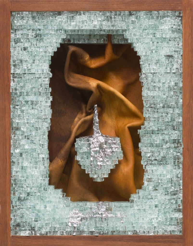 Já no piso superior, o público é recebido por Helô Sanvoy em Eiro, sua primeira mostra individual PM na galeria Cerrado, com curadoria de Divino Sobral. Aqui, a investigação afasta-se do concreto armado e debruça-se sobre a carga histórica e econômica dos materiais cotidianos. O artista cria atritos poéticos utilizando carvão, pó de pau-brasil, vidro estilhaçado, couro e copos americanos para falar sobre a precarização do trabalho e o corpo marginalizado pelo capital.