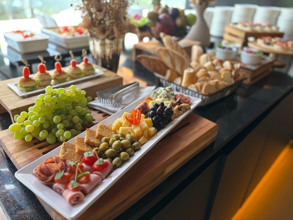 A mesa de entradas abre a refeição com diversidade e frescor, reunindo antepastos, seleção de queijos e embutidos, mix de folhas, salada Caesar, ovos de codorna, além de opções como palmito e alho-poró salteados e salada de grão-de-bico com vinagrete. Pães variados completam o início da experiência.