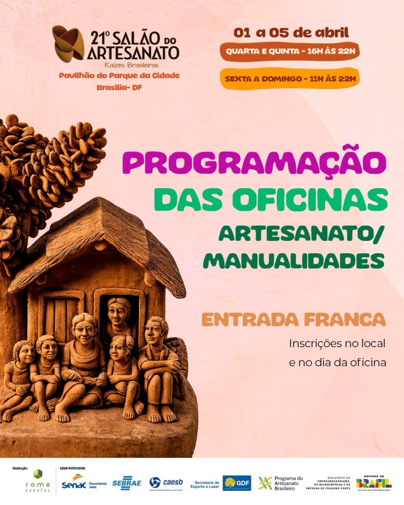 Com cerca de 30 vagas por atividade, as oficinas reforçam o caráter formativo do Salão do Artesanato, consolidando o evento como um espaço de convivência, aprendizado e valorização da cultura brasileira em suas múltiplas expressões.