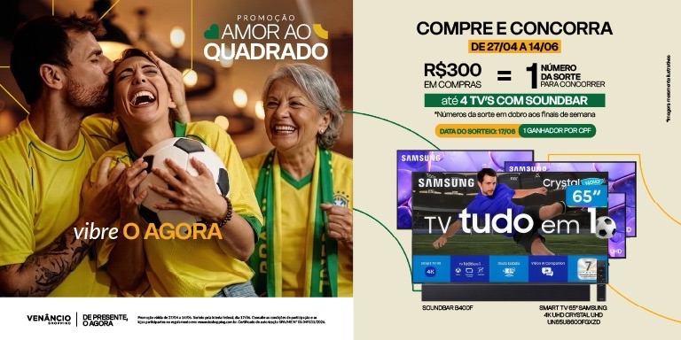 A cada R$300 em compras nas lojas participantes, o cliente recebe um número da sorte para concorrer a quatro Smart TVs Samsung de 65 polegadas com Soundbar. As compras realizadas aos finais de semana garantem cupons em dobro, aumentando as chances de participação na promoção aos sábados e domingos. As trocas devem ser realizadas no balcão da campanha, localizado no corredor gastronômico, próximo à praça de alimentação, no térreo. O sorteio será realizado no dia 17 de junho, pela Loteria Federal, com apuração no dia 18 de junho, ocasião em que serão divulgados os quatro ganhadores. Todas as informações estão no regulamento da campanha, postado nos canais digitais do shopping.