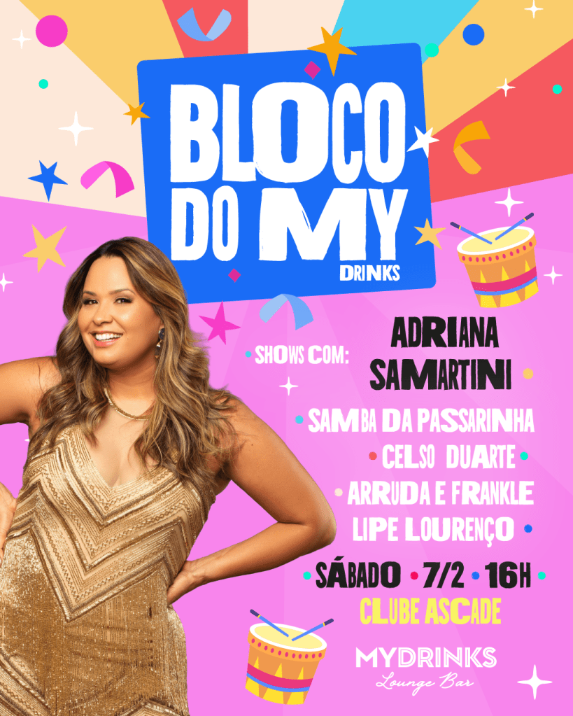 O line-up traz nomes que prometem não deixar ninguém parado: Adriana Samartini com o melhor do axé ao vivo; o Samba da Passarinha garantindo roda animada e clássicos do gênero; Arruda & Frenkle e Celso Duarte GYN apostando em hits pop para todo mundo cantar junto; e Lipe Lourenço, que fecha a experiência com batidas de house tribal para manter a energia lá no alto.