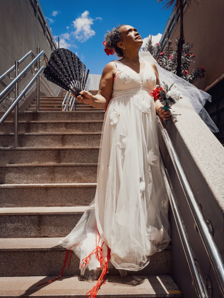 Fabs! é multi-artista visual venezuelana radicada em Brasília desde 2018, atuando também em arte circense e produção cultural. A obra “Os Contos de Fadas são Contos de Fadas” transforma o vestido de noiva com decote em “v”, justo ao corpo de mangas longas e aplique de rendas, num manifesto feminino e feminista, quebrando a ideia de objetificação desse figurino associado à repressão e idealização romântica da mulher. A artista aplicou lágrimas de sangue na parte frontal e na saia escreveu as frases “virgindade é uma construção social”, “não é não”, “Não sou obrigada”, “não vou me calar” e “não sou propriedade”. Nas costas, instalou um par de asas de anjo, com adereço de correntes. Alongou as mangas.