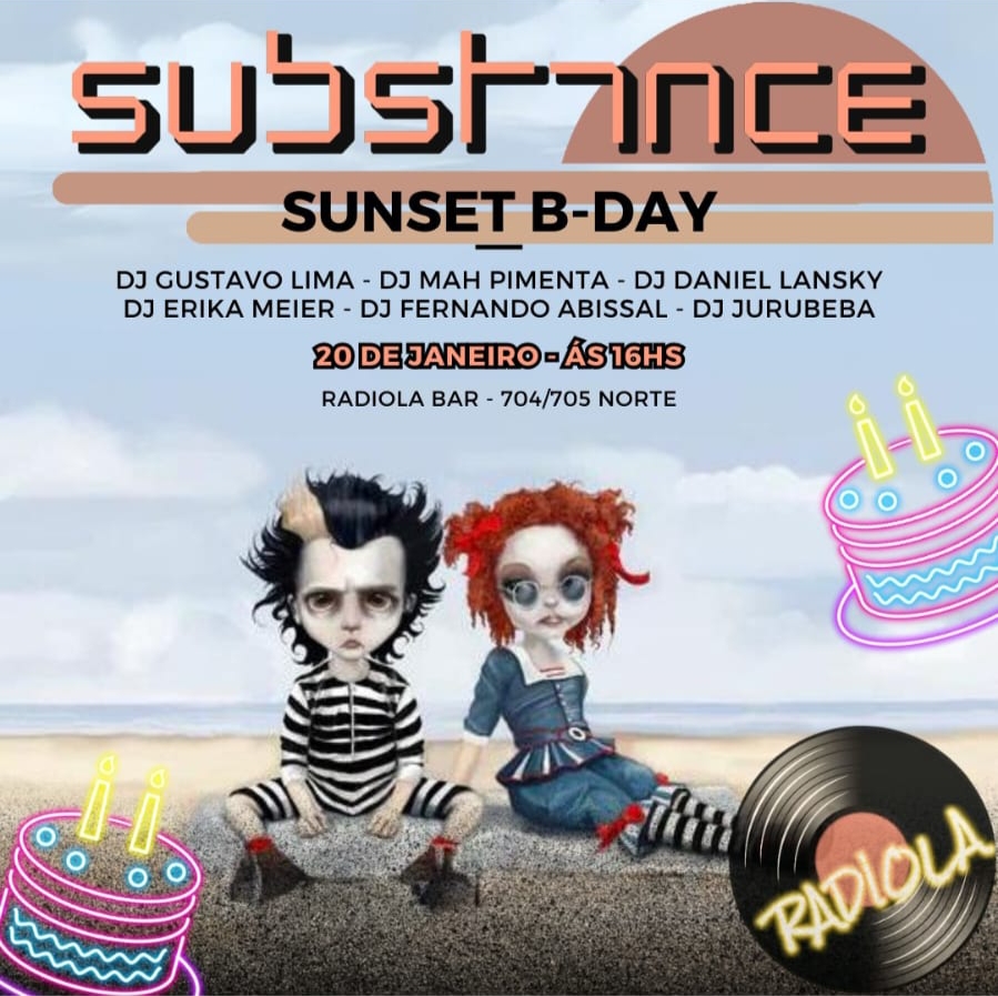 No próximo sábado, dia 20 de janeiro, a partir das 16h (sem hora para acabar), vai rolar mais uma Festa Substance, versão Sunset B-Day, no Radiola Vinil Bar, que fica na 704/705 Norte.
