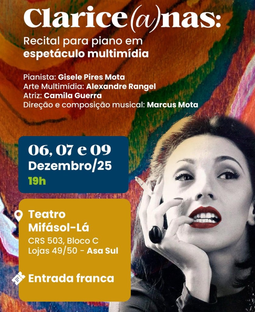SERVIÇO Espetáculo: Clarice(a)nas: Espetáculo para Piano em Espetáculo Multimídia Compositor: Marcus Mota Elenco: Gisele Pires (pianista) e Camila Guerra (atriz) Datas: 06, 07 e 09 de dezembro Horário: 19h Local: Teatro Mifásol-Lá Endereço: CRS 503, Bloco C, Loja 49 – Entrada W2 Sul Entrada: Gratuita Duração: Aproximadamente 40 minutos Acessibilidade (dia 09): interpretação em Libras e áudio descrição.