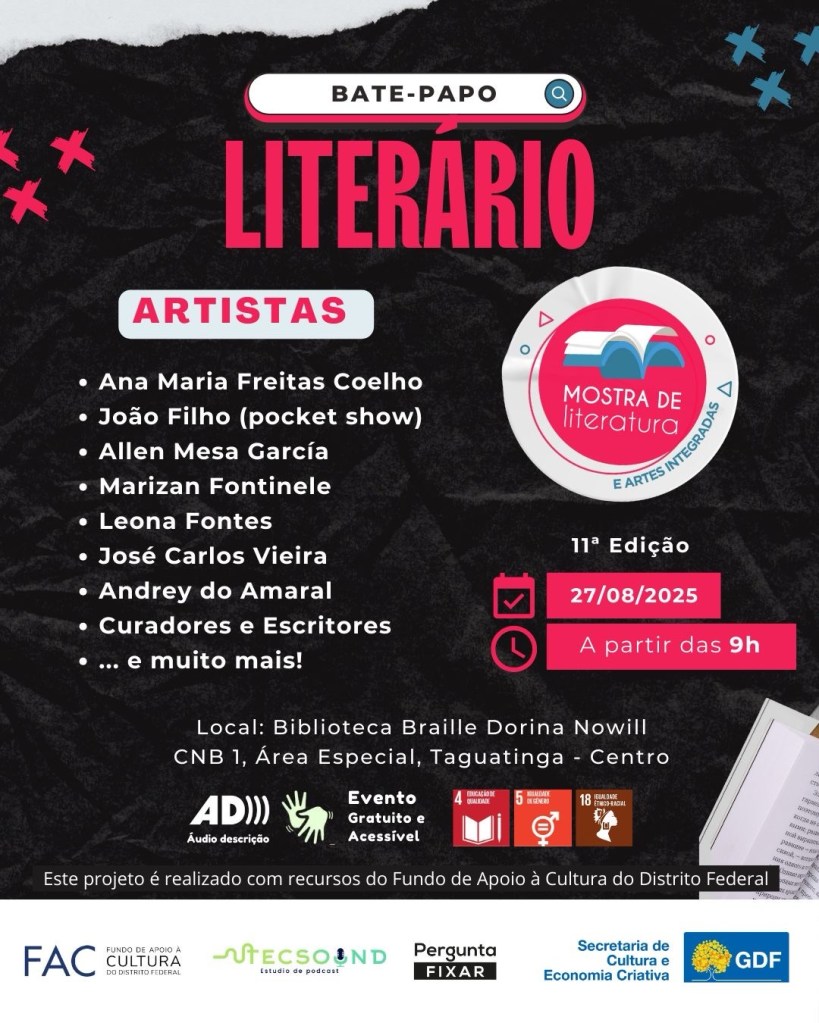 No dia 27 de agosto, a Biblioteca Braille Dorina Nowill de Taguatinga recebe escritores e artistas de outras linguagens culturais na 11ª edição da Mostra de Literatura.