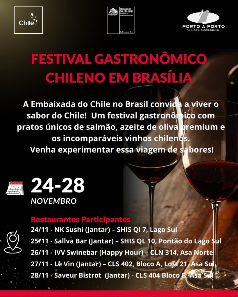 A Embaixada do Chile no Brasil tem o prazer de convidá-lo(a) para o Festival Gastronômico Chileno, um evento que reúne restaurantes de Brasília com pratos inspirados na rica culinária do Chile, elaborados com produtos emblemáticos como salmão, azeite de oliva premium e os renomados vinhos chilenos.