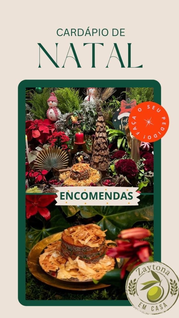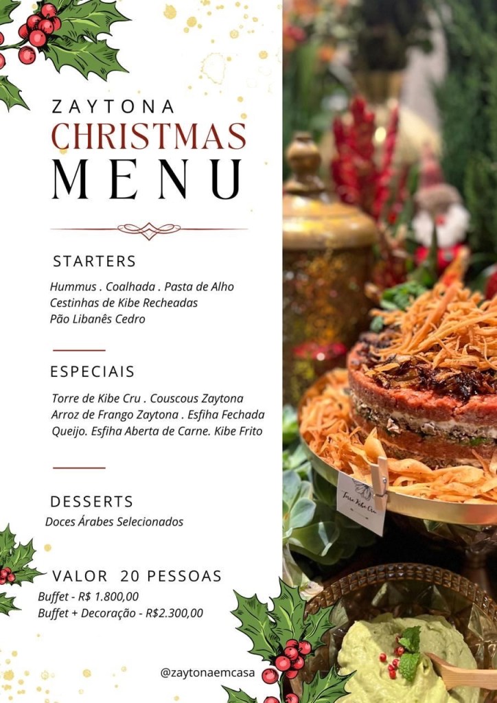 O Zaytona Mini Market – que é um local completo e com várias delícias árabes, como quibes, esfihas, pastas, grãos, especiarias, biscoitos, berinjelas, charutos, sorvetes, vinhos, chopes de várias marcas, bebidas, doces libaneses está com um cardápio especial de Ceia de Natal e de Réveillon. Também tem os azeites especiais, as azeitonas gregas e os pães artesanais da marca Cedro, que é a fábrica de pães da Zaytona.