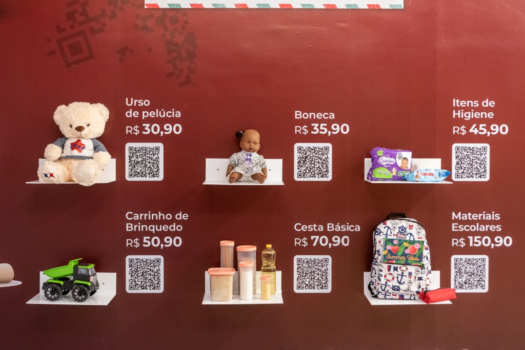 Para quem não sabe, funciona assim: o cliente só precisa escolher o objeto a ser doado, com o valor respectivo, abrir seu aplicativo do banco para ler o QR Code, conferir o valor e confirmar a transferência, cujas doações começam em R$ 30,90. São opções para todos os gostos e bolsos, como brinquedos, roupas, kits de higiene, cestas básicas, entre outros, com valores que vão até R$ 150,90. No painel, as doações ocorrem por meio de valores pré-selecionados para cada item. Entretanto, é possível doar qualquer quantia nos totens espalhados pelo shopping.