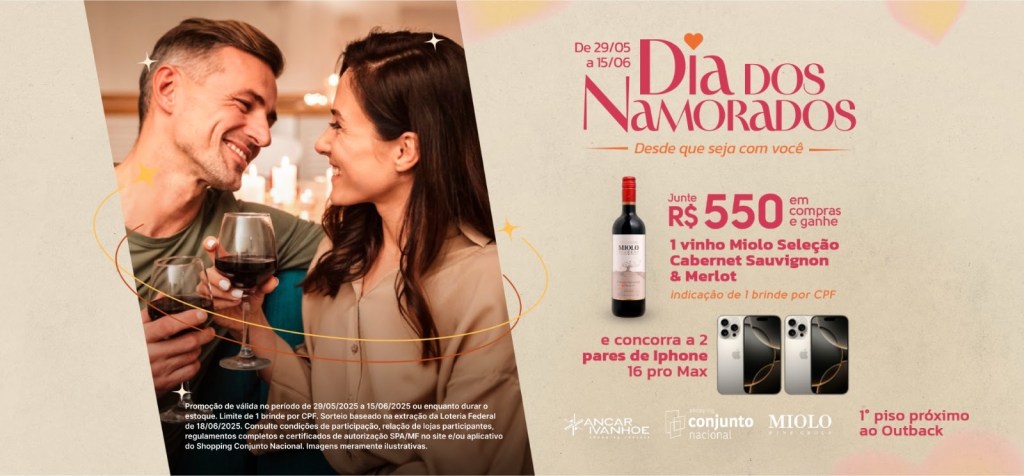 E para quem quer celebrar o amor com estilo, o Conjunto Nacional lançou a campanha especial de Dia dos Namorados. Até 15 de junho, a cada R$550 em compras nas lojas participantes, o cliente ganha um vinho Miolo Seleção Cabernet Sauvignon & Merlot e ainda concorre ao sorteio de dois pares de iPhone 16 Pro Max.
