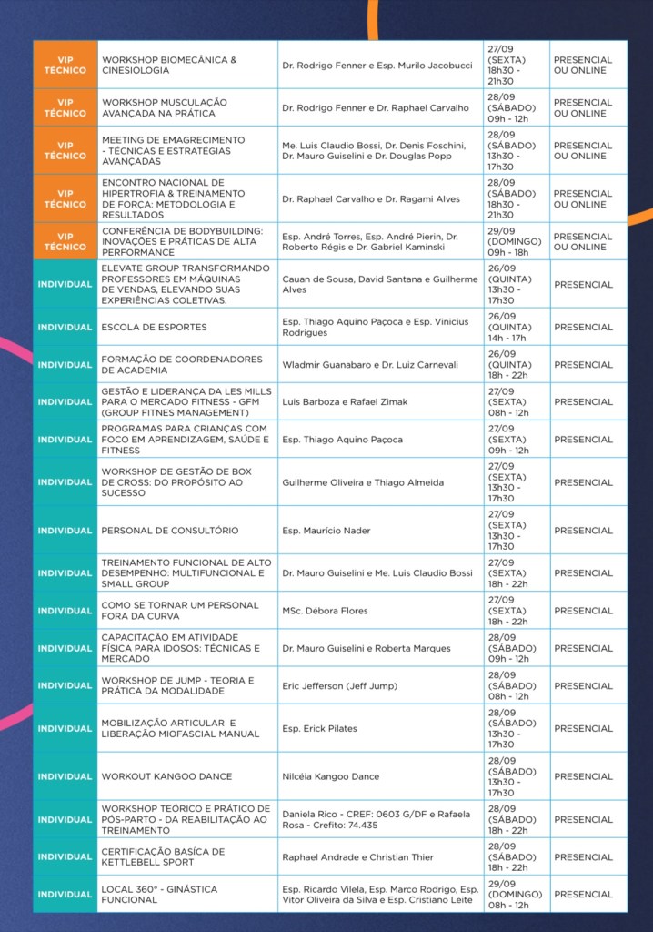 Entre os cursos, destaca-se o Módulo de Gestão, um encontro de grandes empresários; MEETING DE GESTÃO, um grande debate sobre futuro do negócio academia no Brasil, Curso de gestão de academias aquáticas, Curso de Vendas; Atividade física para Terceira Idade; Nutrição esportiva; Bodybuilding; Gestão; Personal trainer; Fitness aquático; Zumba; Natação Infantil; Treinamento Funcional, Emagrecimento e muitos outros.