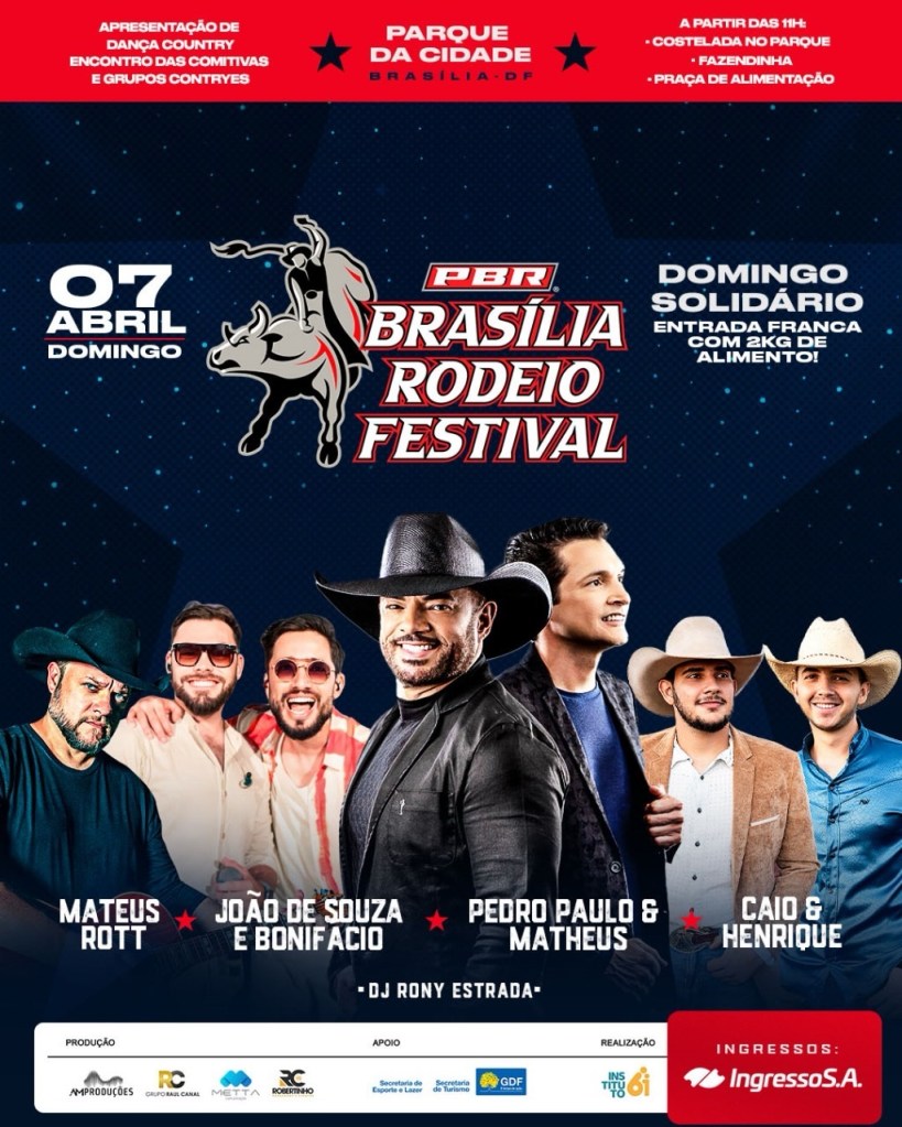 O PBR Brasília Rodeio Festival acontecerá no estacionamento 9 do Parque da Cidade e tem como objetivo se tornar uma das referências da Capital Federal com diversas atrações dentro e fora da arena. Realizado pelo Instituto 61 e produzido em parceria pela AM Produções, Grupo Raul Canal, Metta Comunicação e Robertinho Produções & Eventos, o evento tem apoio do Governo do Distrito Federal.